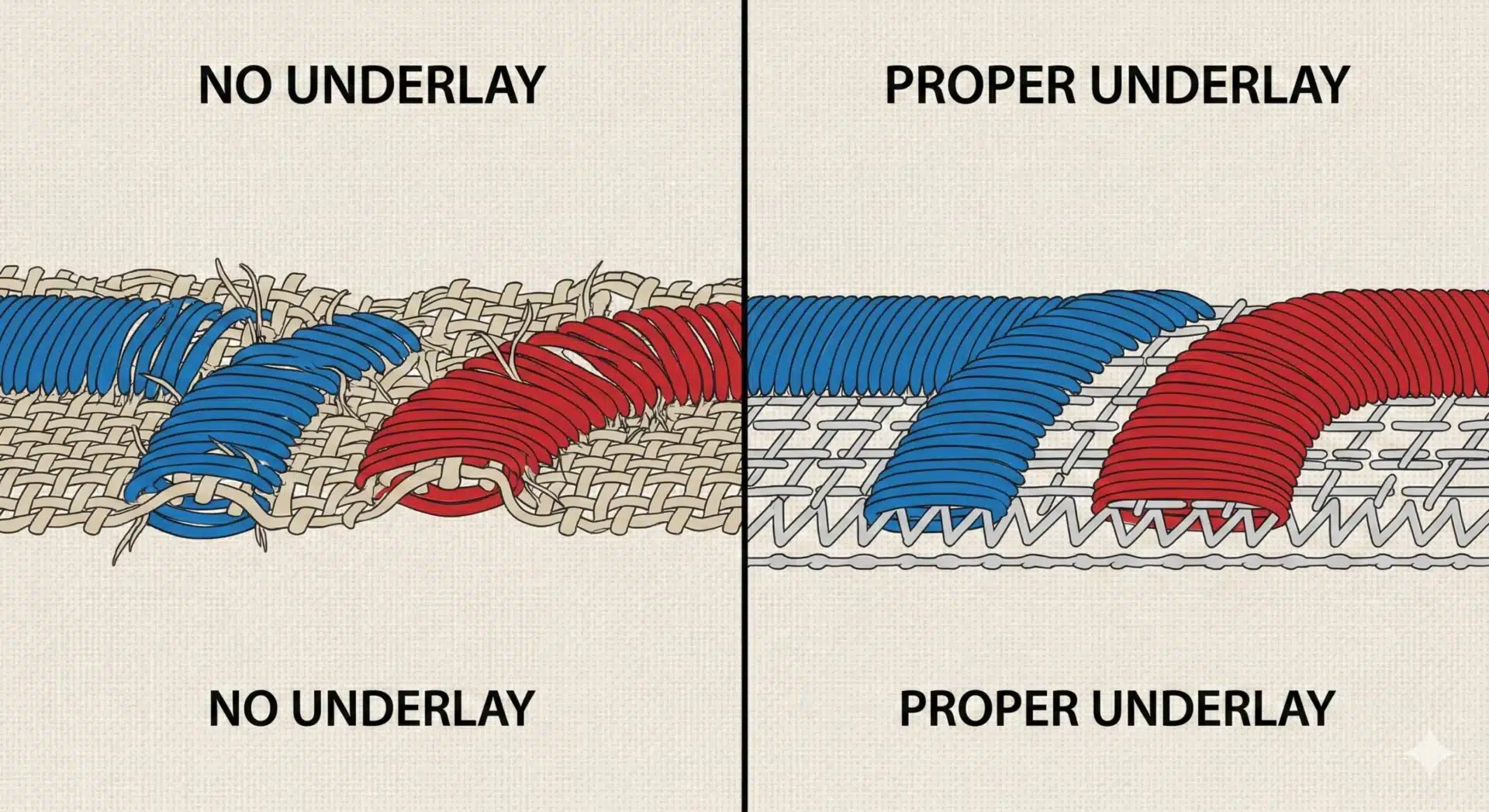 Without proper underlay, top stitches sink into fabric and lose shape. This results in uneven surfaces and distorted designs.