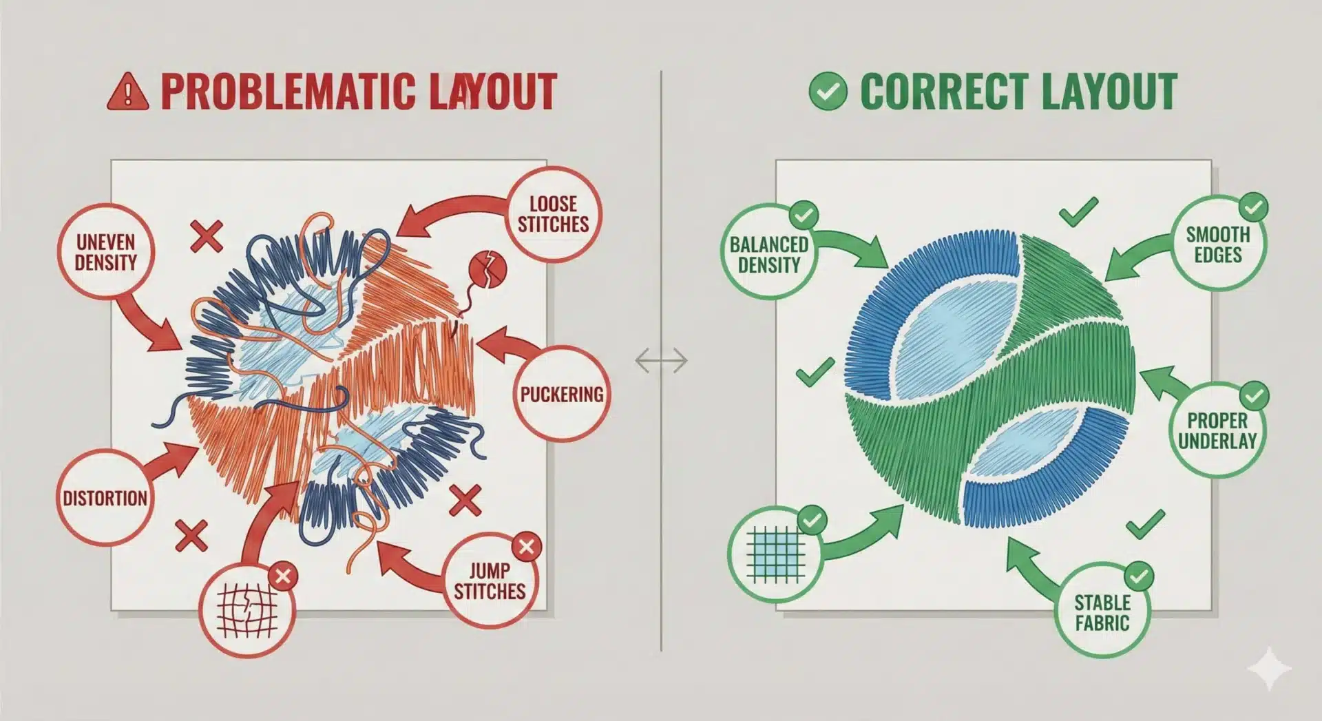 Large designs require careful stitch sequencing to prevent excessive trims and thread buildup. Professional digitizers plan stitch paths to maintain smooth embroidery flow.