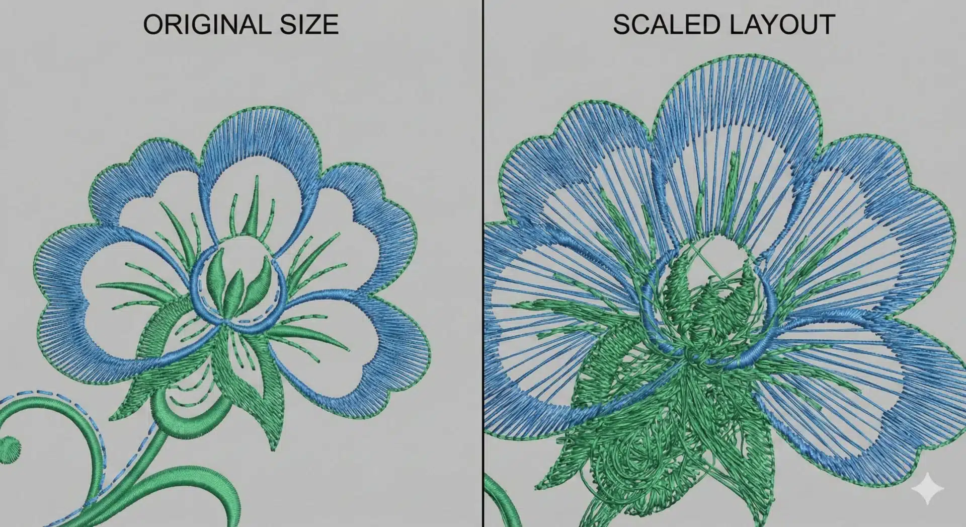 When an embroidery design is scaled, the stitch count and density change. Enlarging a design without adjusting stitch density creates gaps, while reducing size increases stitch tension.